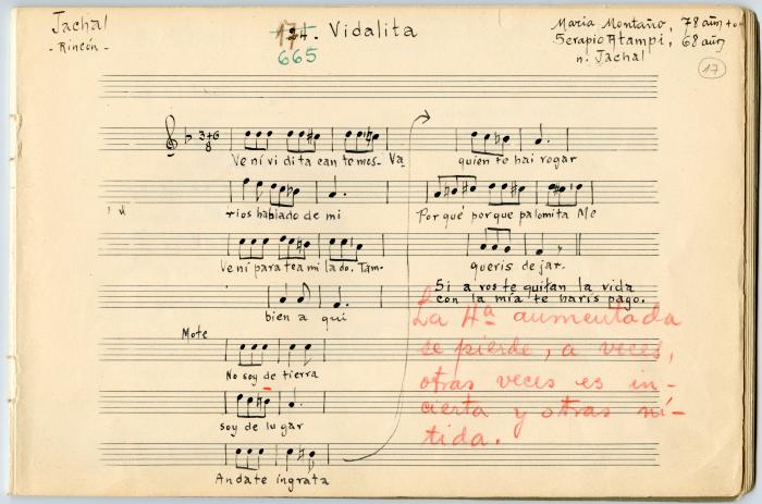 | Notes: | La transcripción musical contiene la letra del registro sonoro. En el cuaderno de pautaciones dice "La 4° aumentada se pierde, a veces, otras veces es incierta y otras nítida". |