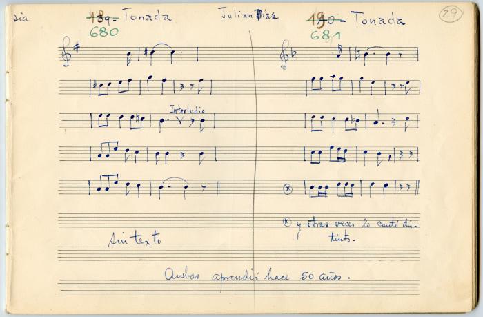 En el cuaderno de pautaciones dice "Sin texto" y "Ambas aprendió hace 50 años". |