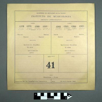 Vega, Carlos,Eiseinstein, Silvia, González, Laurentino. [Zamba]. Instituto Nacional de Musicología “Carlos Vega”. Humahuaca , 6 Febrero - 21 Marzo 1945. Audio. AR-INM-F001INM-SCT-RS-4382 |
