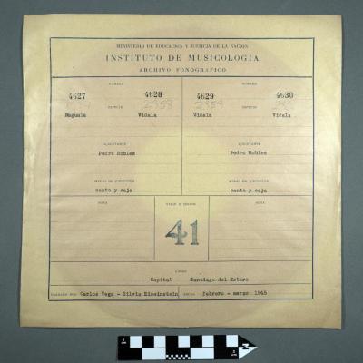 Vega, Carlos,Eiseinstein, Silvia, Robles, Pedro. [Vidala]. Instituto Nacional de Musicología “Carlos Vega”. Añatuya , 6 Febrero - 21 Marzo 1945. Audio. AR-INM-F001INM-SCT-RS-4629 |