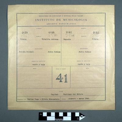 Vega, Carlos,Eiseinstein, Silvia, Robles, Pedro. [Vidalita serrana]. Instituto Nacional de Musicología “Carlos Vega”. Añatuya , 6 Febrero - 21 Marzo 1945. Audio. AR-INM-F001INM-SCT-RS-4640 |
