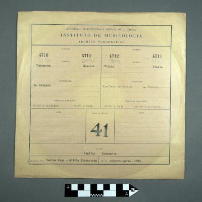 Vega, Carlos,Eiseinstein, Silvia, Delgado, Alfredo. [Chacarera]. Instituto Nacional de Musicología “Carlos Vega”. San Fernando del Valle de Catamarca , 6 Febrero - 21 Marzo 1945. Audio. AR-INM-F001INM-SCT-RS-4710 |