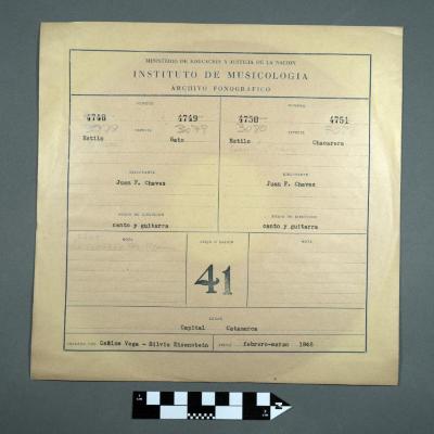 Vega, Carlos,Eiseinstein, Silvia, Chaves, Juan. [Gato]. Instituto Nacional de Musicología “Carlos Vega”. San Fernando del Valle de Catamarca , 6 Febrero - 21 Marzo 1945. Audio. AR-INM-F001INM-SCT-RS-4749 |