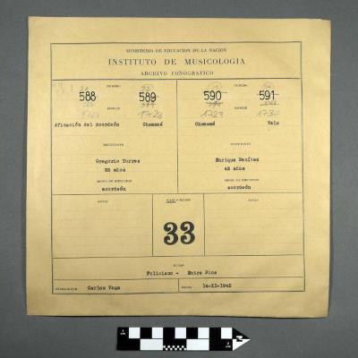 Vega, Carlos, Torres, Gregorio. [Afinación del acordeón]. Instituto Nacional de Musicología “Carlos Vega”. San José de Feliciano , 7 - 29 Noviembre 1942. Audio. AR-INM-F001INM-SCT-RS-3190 |