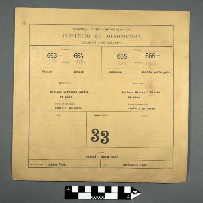 Vega, Carlos, García, Mariano. [Habanera]. Instituto Nacional de Musicología “Carlos Vega”. Paraná , 7 - 29 Noviembre 1942. Audio. AR-INM-F001INM-SCT-RS-3271 |