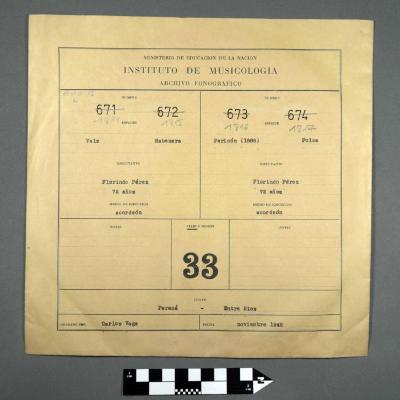 Vega, Carlos, Pérez, Florindo. [Polca]. Instituto Nacional de Musicología “Carlos Vega”. Paraná , 7 - 29 Noviembre 1942. Audio. AR-INM-F001INM-SCT-RS-3280 |