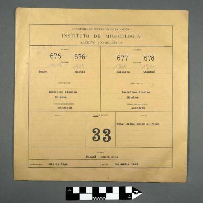 Vega, Carlos, Almeira, Isabelino. [Habanera]. Instituto Nacional de Musicología “Carlos Vega”. Paraná , 7 - 29 Noviembre 1942. Audio. AR-INM-F001INM-SCT-RS-3283 |